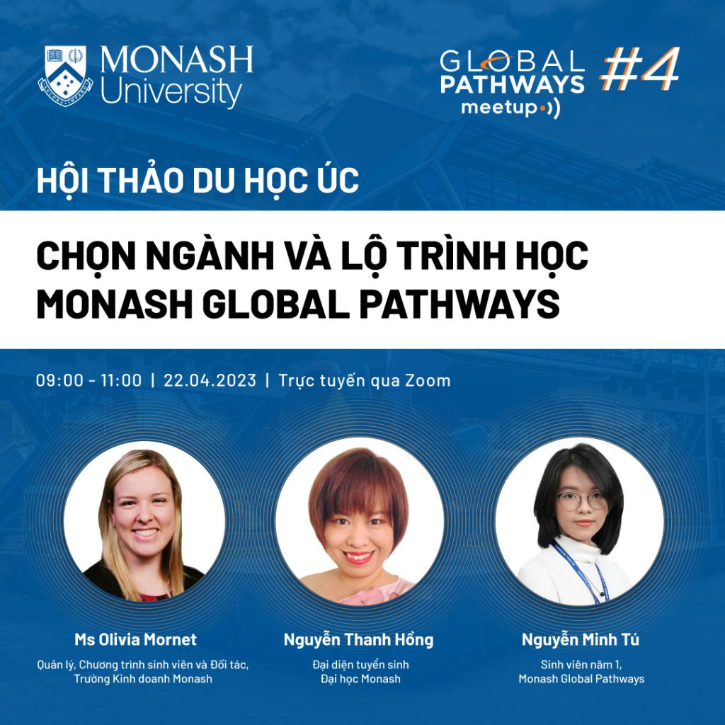 Monash Global Pathways Meetup là sự kiện du học trực tuyến được tổ chức bởi chương trình du học Global Pathways và Đại học Monash, Úc. Tại hội thảo du học Monash Global Pathways Meetup, các chuyên gia giáo dục quốc tế, sinh viên hiện tại và cựu sinh viên từ Đại học Monash sẽ chia sẻ các nội dung liên quan đến điều kiện tuyển sinh, học phí, học bổng Đại học Monash năm 2023 cùng trải nghiệm và kinh nghiệm du học hữu ích để chuẩn bị hành trang cho du học sinh tương lai.